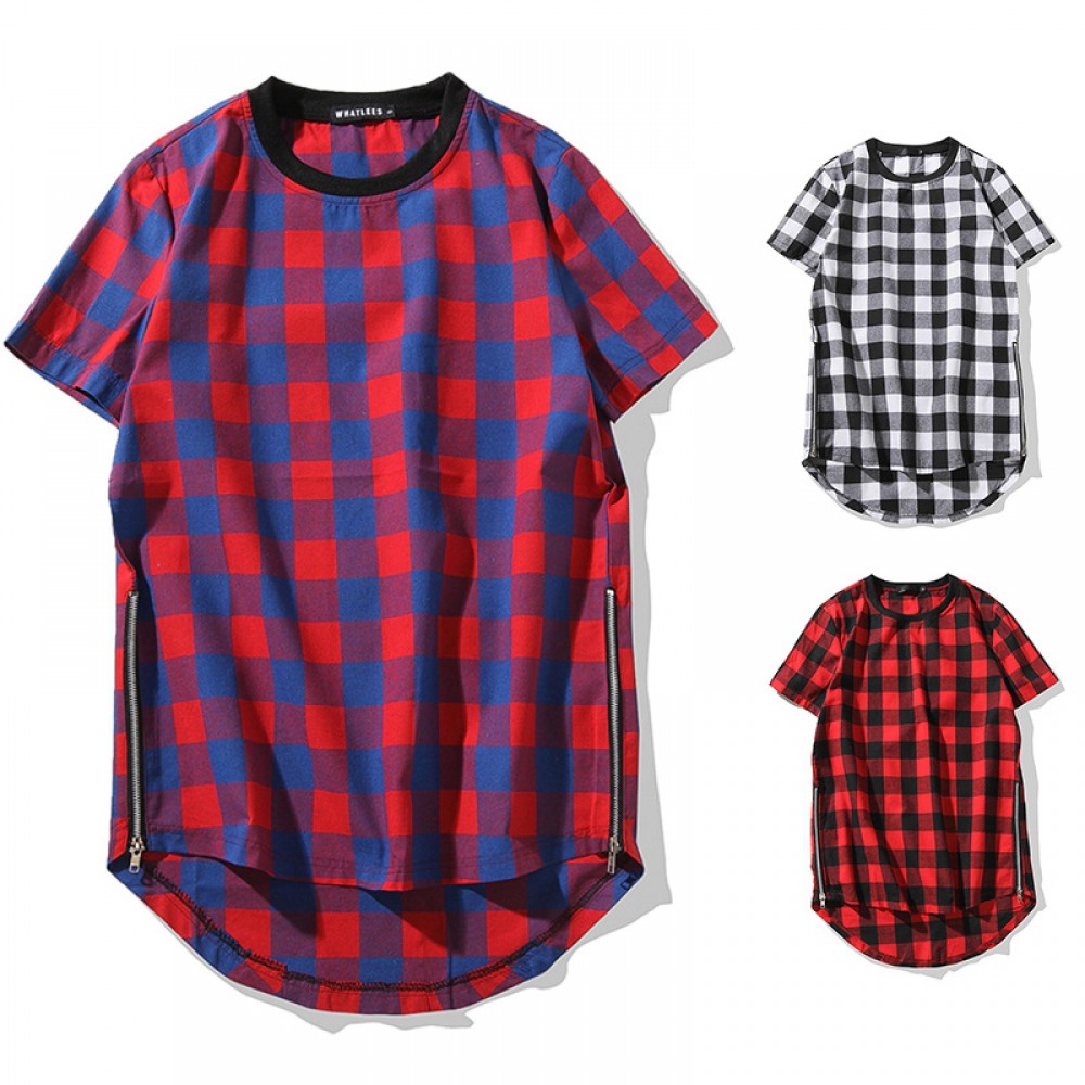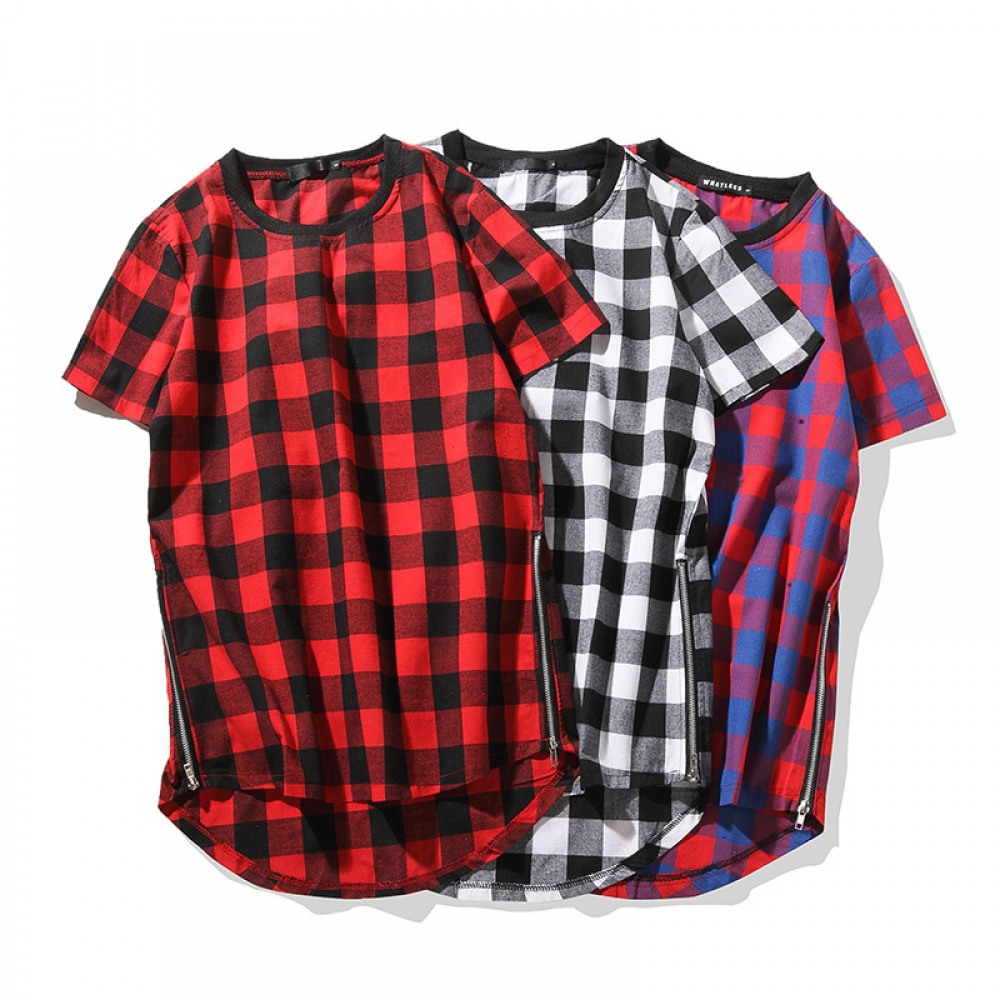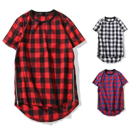 Men's High Street Long Plaid Double Side Zipper Round Neck Arc Short Sleeve T-Shirt