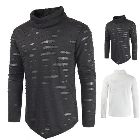 Personality Pile Collar Hip Hop Hole Inverted Triangle Dress Men's Casual Long-Sleeved T-Shirt